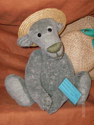 Ich bin der große Florian, immerhin mit meinem langen Hals noch 40 cm groß. Geboren wurde ich schon am 01. Juli 1999, bin also ein schon betagter Bär in dieser Runde. Mein Fell ist etwas Besonderes, nämlich grauer Rohmohair. meine großen Ohren verstecke ich meist unter einem Strohhut.