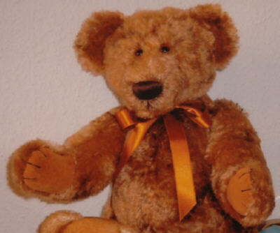Hallo ich bin der große Nathan, 50 cm groß,geboren am 29. Juli 2003. Hergestellt aus feinstem blond, braunem Batik-Mohair, leicht gekräuselt und edlen Velourpfoten. Ich bin zwar groß, blicke jedoch immer etwas ängstlich aus meinen braunen Kristallaugen.